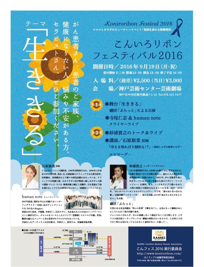 第2回目の「こんいろリボンフェスティバル2016」では、1部、2部方式で開催しました。1部では、劇団「ぷらっと」によるガンを告知された時の様子やご家族の心の模様を演劇に。そして、お馴染みのhumannoteによるライブ。